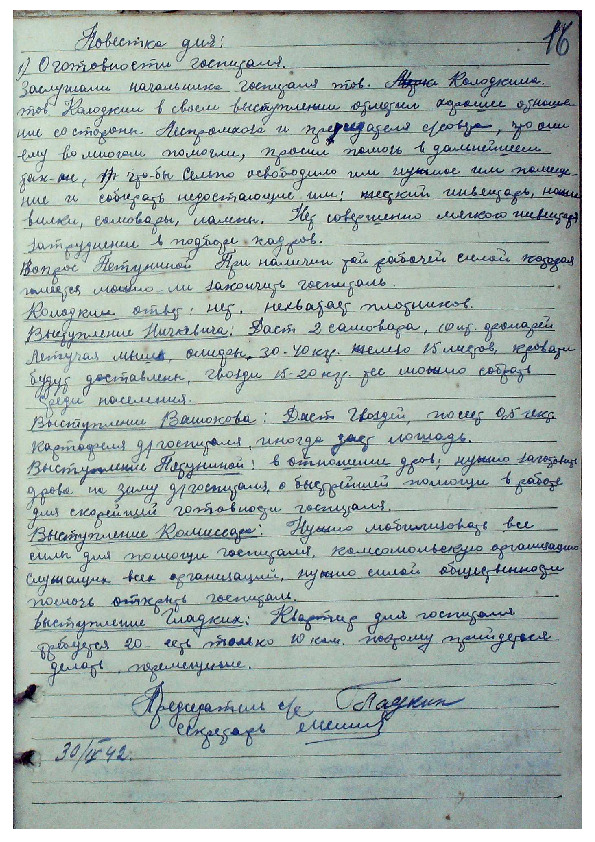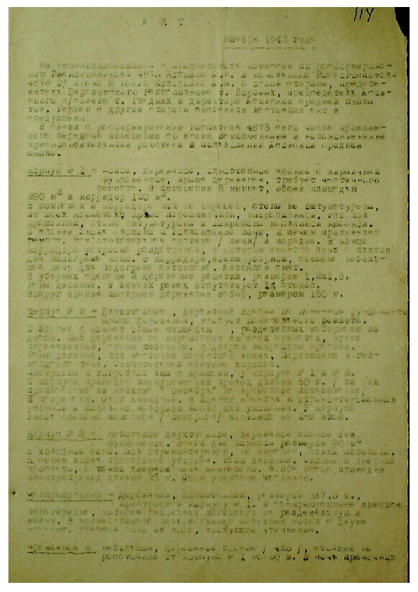 Эвакогоспиталь №4875 был сформирован в мае 1942 года. Для размещения госпиталя было выделено 3 здания, требующих в том числе капитального ремонта: деревянное одноэтажное здание с кирпичным фундаментом на 8 комнат общей площадью 290 м2, деревянное двухэтажное здание с каменным фундаментом на 6 комнат, небольшое двухэтажное здание без фундамента на 2 комнату общей площадью 90 м2. Имелся санпропускник и прачечная. Взглавил госпиталь Колодкин Андрей Васильевич, 24.10.1911 г.р. (награжден в 1944 году Орденом Красной Звезды, в 1945 году Орденом Отечественной войны 2 степени, медалью "За боевые заслуги"). В ноябре 1942 года эвакогоспиталь №4875 был расформирован. |