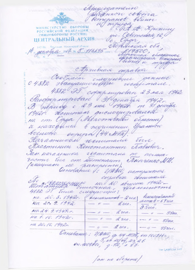 Госпиталь был сформирован Уральским военным округом. В нём лечили раненных солдат и офицеров. Начальником госпиталя был Пластинин Николай Павлович, заместителем по полит. части ст. лейтенант Пипченко М.И. Ординцы с пониманием и заботой отнеслись к раненым бойцам. В госпиталь они приносили подарки: мёд, молоко, масло, яйца, мясо, картофель и прочие овощи. В первые 2 -3 дня работы госпиталя жители Орды и района сдали на его обустройство 250 табуретов и стульев, 60 столов, 250 полотенец, 130 комплектов нательного белья, 20 одеял, 240 наволочек, 452 простыни, 360 подушек, 1100 тарелок и много других вещей. Желающих помогать и работать в госпитале было много. |