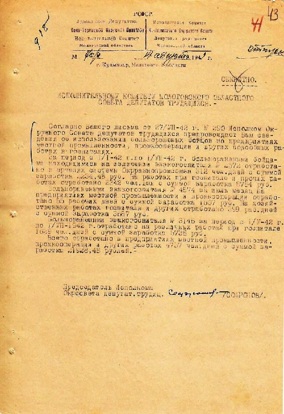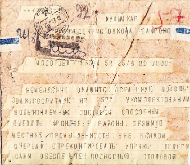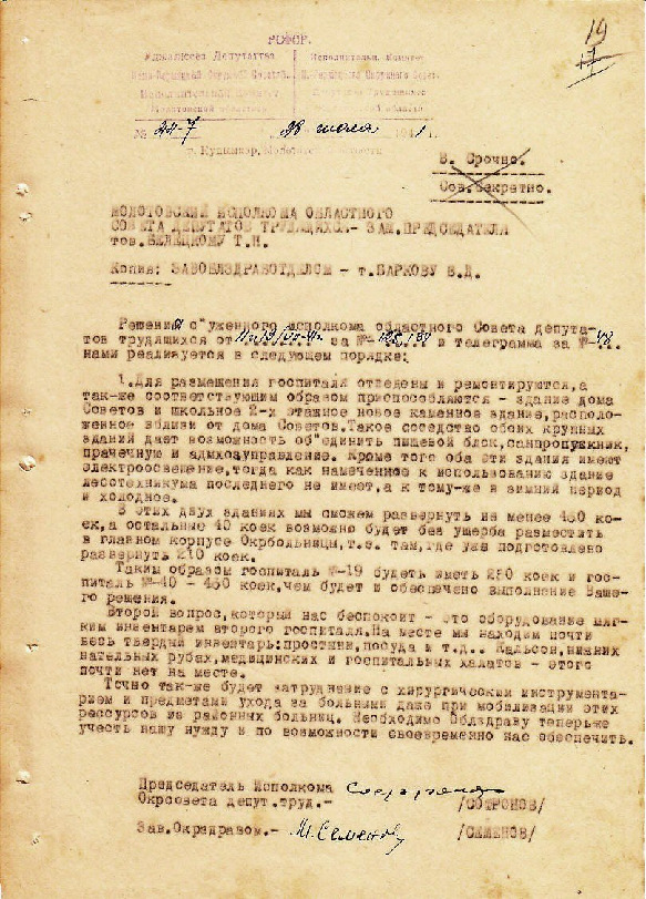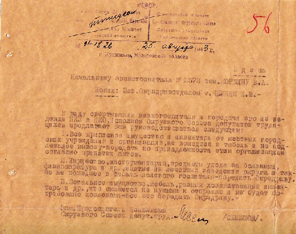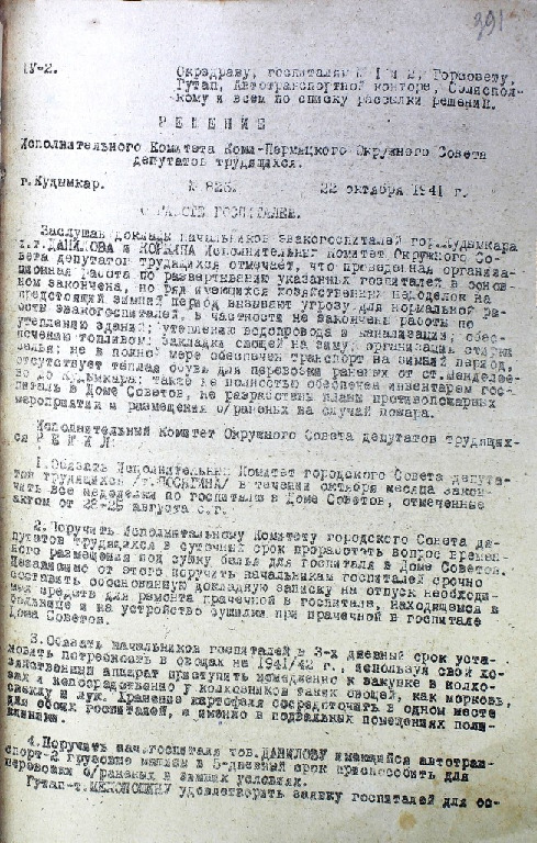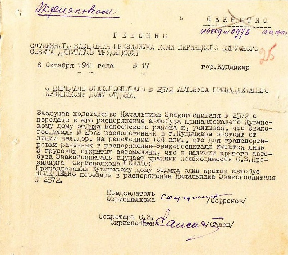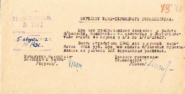Госпиталь № 2572, сформированный в г. Кудымкар, действовал как сортировочный, имел профиль инфекционный и общехирургический. Сортировочное отделение действовало в здании Дома колхозника на железнодорожной станции Менделеево на 70 коек. На основании решения суженого заседания исполкома областного Совета трудящихся от 11.07.1941 была развернута работа по подготовке госпиталя. Для госпиталя были отведены здание дома Советов и новое каменное двухэтажное здание школы, расположенное вблизи дома Советов. Соседство зданий позволило объединить пищевой блок, санпропускник, прачечную и адмхозуправление. В короткие сроки (15 дней) здание гостиницы, выделенное для эвакогоспиталя, было обеспечено центральным отоплением и горячим водоснабжением, в здании была закончена наружная и внутренняя сеть канализации с водопроводом, проведена электропроводка целого этажа с оборудованием физкабинета, приспособлены операционные и пять перевязочных комнат, заново оборудованы 8 душевых точек и помещение прачечной с необходимым оборудованием, приспособлен пищеблок, складские помещения. Питание раненых обеспечивали колхозы, предоставлявшие в качестве шефской помощи мясо, овощи, масло, мед. В распоряжении госпиталя для транспортировки раненых использовалось 3 грузовых крытых автомашины и один крытый автобус, переданный ЭГ Кувинским домом отдыха. |