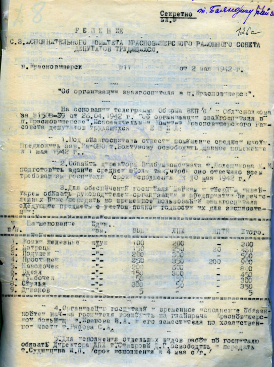 Эвакогоспиталь №3783 был сформирован в г. Березники 18 мая 1942 года, как восстановительно-хирургический. С 15 октября 1943 года передислоцирован в г. Харьков УССР, где действовал до 15 марта 1944 года. Во время действия госпиталя в г.Березники умерло 9 человек, первый раненый умер 19 октября 1942 года. 8 человек захоронено в г. Березники, 1 могила в с. Кропачево. |
